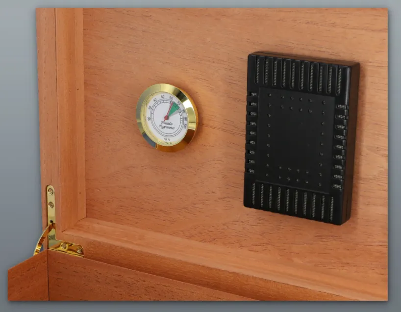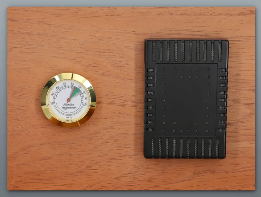 6. Wilgotność powinna wynosić około 70%. Jest ona kontrolowana przez higrometr, który powinien być przymocowany również na środku pokrywy humidora (higrometr jest magnetyczny).