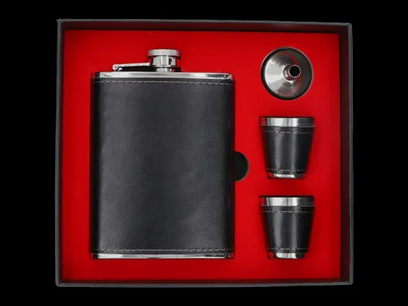 Elegancki zestaw upominkowy z piersiówką to idealny prezent dla miłośników dobrego stylu i chwil relaksu. Piersiówka o pojemności 8 oz (240 ml) jest wykończona stylową okładziną, dzięki czemu świetnie wygląda i dobrze leży w dłoni. W komplecie znajdują się dwa kieliszki o pojemności 35 ml oraz praktyczny lejek, które umożliwiają wygodne serwowanie ulubionych trunków. Całość zapakowana jest w gustowne pudełko, co sprawia, że zestaw od razu gotowy jest do wręczenia.