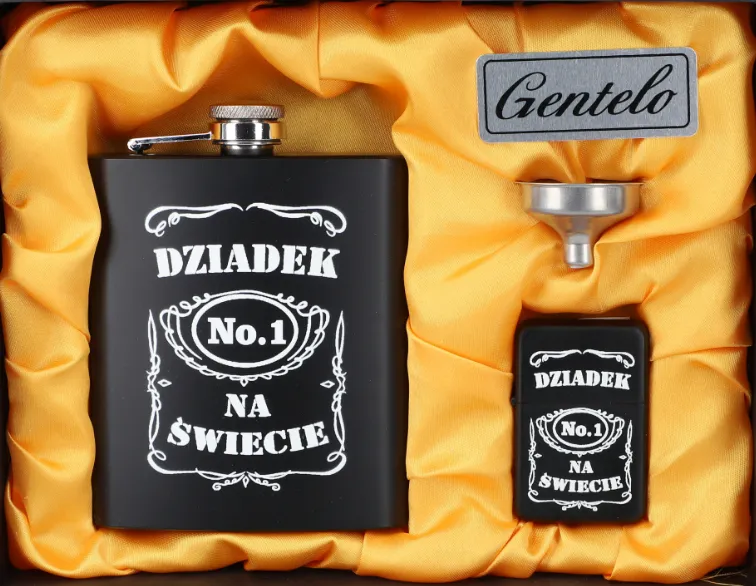 Elegancki zestaw prezentowy marki Gentelo, zaprojektowany specjalnie z myślą o dziadkach. W komplecie znajduje się stylowa, matowo-czarna piersiówka z nadrukiem „Dziadek No.1 na świecie”, dopasowana zapalniczka oraz praktyczny lejek ułatwiający nalewanie. Całość zapakowana jest w estetyczne, satynowe pudełko, które podkreśla wyjątkowy charakter upominku.