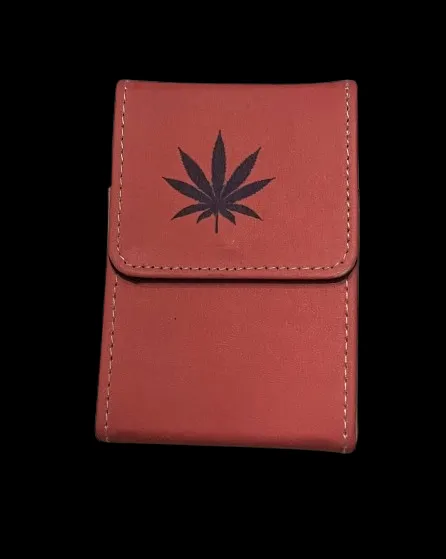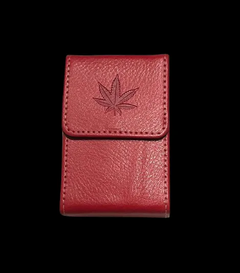 Czerwone Pudełko Etui na Paczkę Papierosów z Wytłoczonym Liściem Marihuany