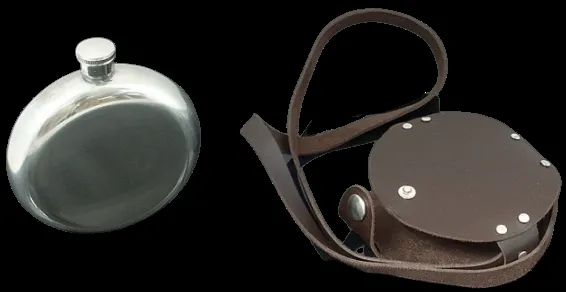 Srebrne wykończenie w połączeniu z brązowym skórzanym etui nadaje piersiówce luksusowy wygląd, idealny na prezent lub do osobistego użytku.
