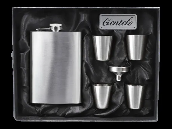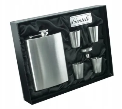 Zestaw prezentowy Gentelo zawiera stylową stalową piersiówkę oraz cztery kieliszki i lejek, wszystko zapakowane w eleganckie, czarne pudełko prezentowe z satynową wyściółką. Całość prezentuje się niezwykle klasycznie i ponadczasowo – gładka powierzchnia stali nierdzewnej nadaje zestawowi elegancki wygląd, który przypadnie do gustu każdemu miłośnikowi dobrego stylu.