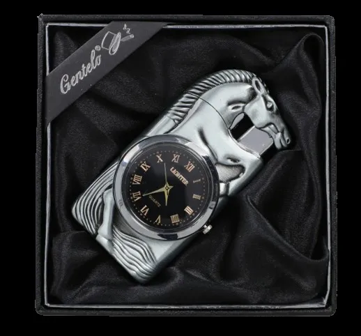 Przedmiotem niniejszej aukcji jest zapalniczka gazowa renomowanej marki Gentelo! Jest to elegancki o model o standardowej wielkości dzięki czemu idealnie leży w dłoni. Wbudowany zegarek w zapalniczce sprawia, że wyróżnia się na tle innych a w połączeniu z opakowaniem prezentowym sprawia, że idealnie nadaje się na prezent. Ponadto zamykany w postaci głowy wizerunek konia na zapalniczce podkreśla jej nietypowy i oryginalny wygląd.