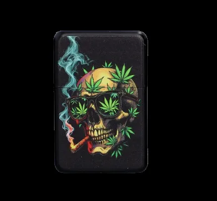 Solidna metalowa zapalniczka benzynowa z efektownym nadrukiem w stylu cannabis – czaszka, liście marihuany i dym tworzą mocny, wyrazisty design. Zapalniczka jest wielokrotnego użytku, napełniana benzyną, idealna na prezent, do kolekcji lub codziennego użytku. Oryginalny gadżet dla osób z charakterem i dystansem do klasyki.
