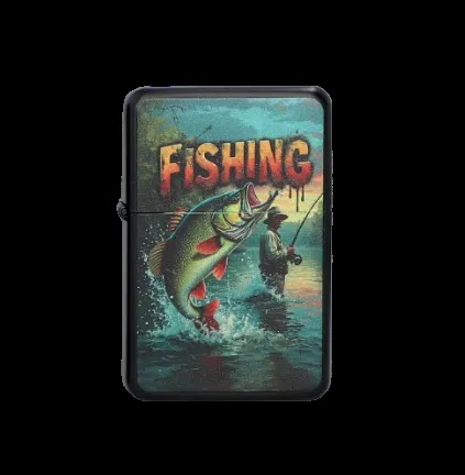 Zapalniczka z grafiką rybaka w wodzie i dynamicznie wyskakującej ryby – doskonała dla fanów sportów wędkarskich. Motyw „FISHING” w stylu amerykańskich plakatów retro dodaje jej niepowtarzalnego charakteru. Wysokiej jakości zapalniczka do napełniania, idealna na wypady nad jezioro, rzekę lub jako prezent tematyczny.