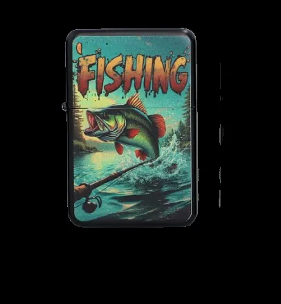 Kolorowa zapalniczka z ilustracją rybaka walczącego z ogromnym drapieżnikiem. Hasło „FISHING” przyciąga wzrok i podkreśla pasję do wędkarstwa. Zapalniczka ma klasyczny design i trwałą metalową obudowę. Idealna do kolekcji lub jako praktyczny prezent dla każdego miłośnika łowienia ryb.
