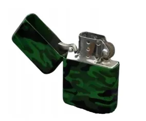 Elegancka zapalniczka benzynowa marki Gentelo, utrzymana w klasycznym, wojskowym wzorze moro, łączącym odcienie zieleni, brązu i czerni. Produkt posiada metalowy korpus, solidny mechanizm zapalający oraz charakterystyczne tłoczenie z logo Gentelo. Dzięki kompaktowym wymiarom (5,8 x 3,9 x 1,3 cm) idealnie mieści się w kieszeni, co czyni ją idealnym dodatkiem na wyprawy survivalowe lub jako oryginalny prezent.
