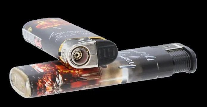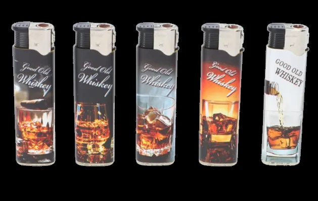 Zestaw zapalniczek gazowych z realistycznym nadrukiem szkła whisky – klasyczny design dla fanów mocnych trunków i stylu retro.