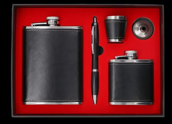 Zestaw upominkowy „Gentelo” to stylowy komplet łączący funkcjonalność i elegancję. Zawiera dwie klasyczne piersiówki – większą o pojemności 8 oz (240 ml) i mniejszą 4 oz (120 ml) – oraz kieliszek, długopis i lejek, dzięki którym zawsze będziesz gotowy na degustację ulubionego trunku w dobrym stylu. Całość prezentuje się niezwykle estetycznie, co czyni zestaw idealnym prezentem na różne okazje.